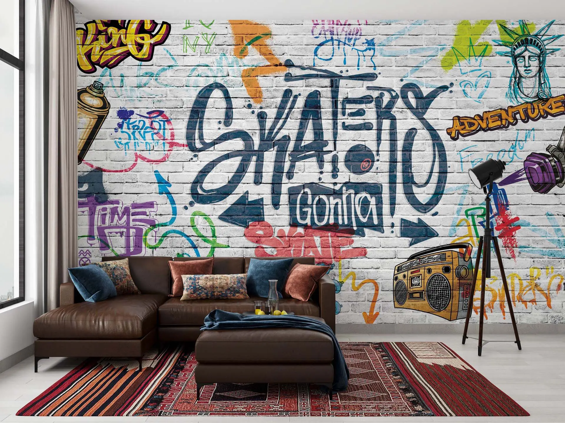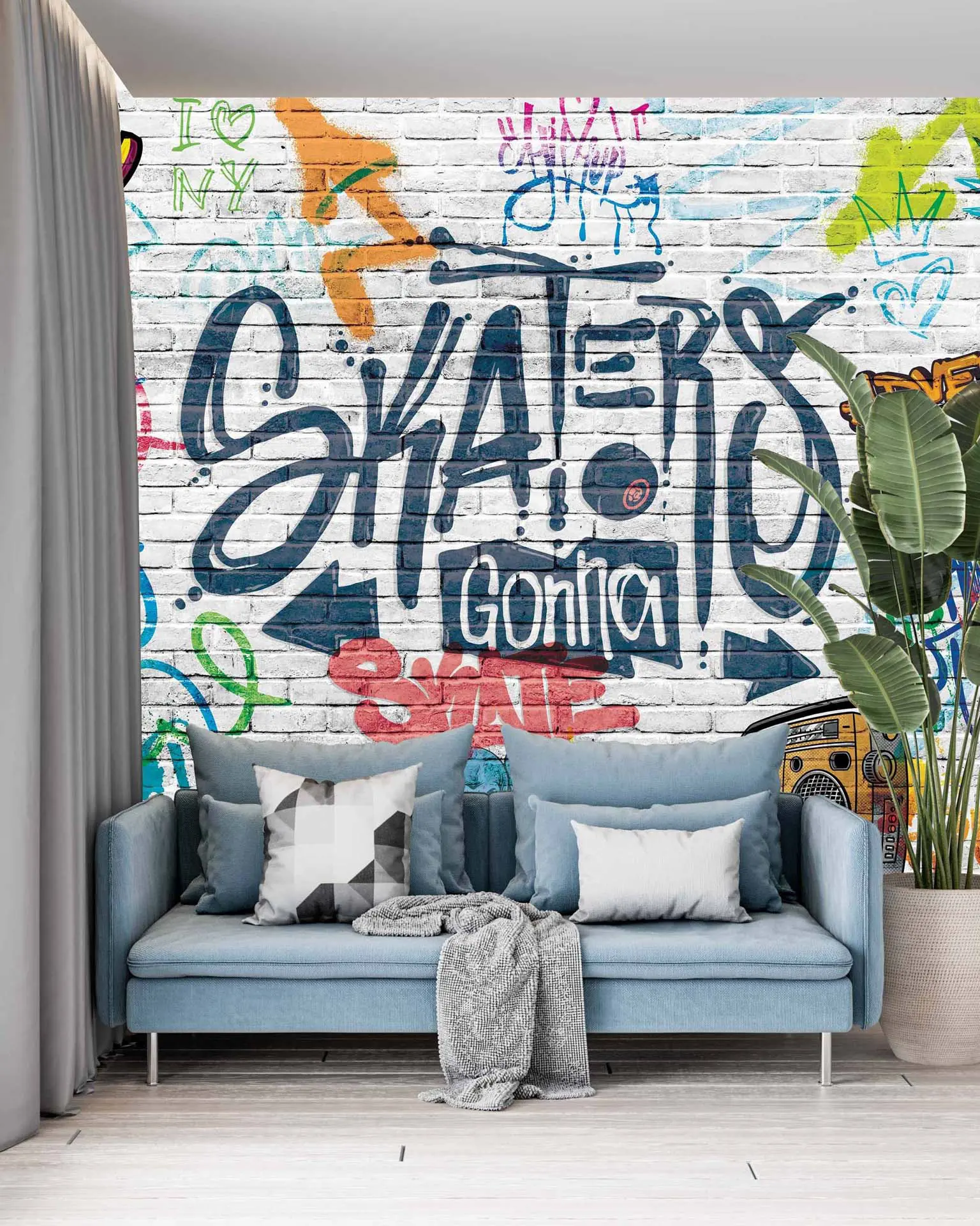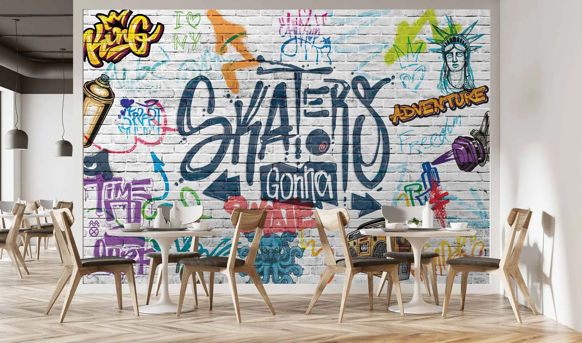 Urban White Brick Wall Graffiti Wallpaper – ‘Skaters’ Theme for Trendy and Creative Spaces