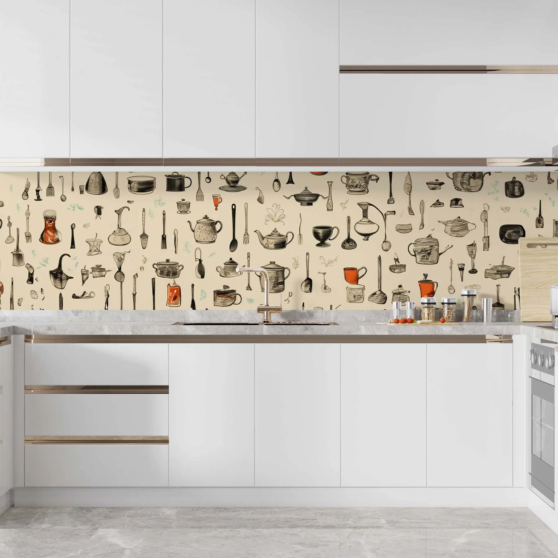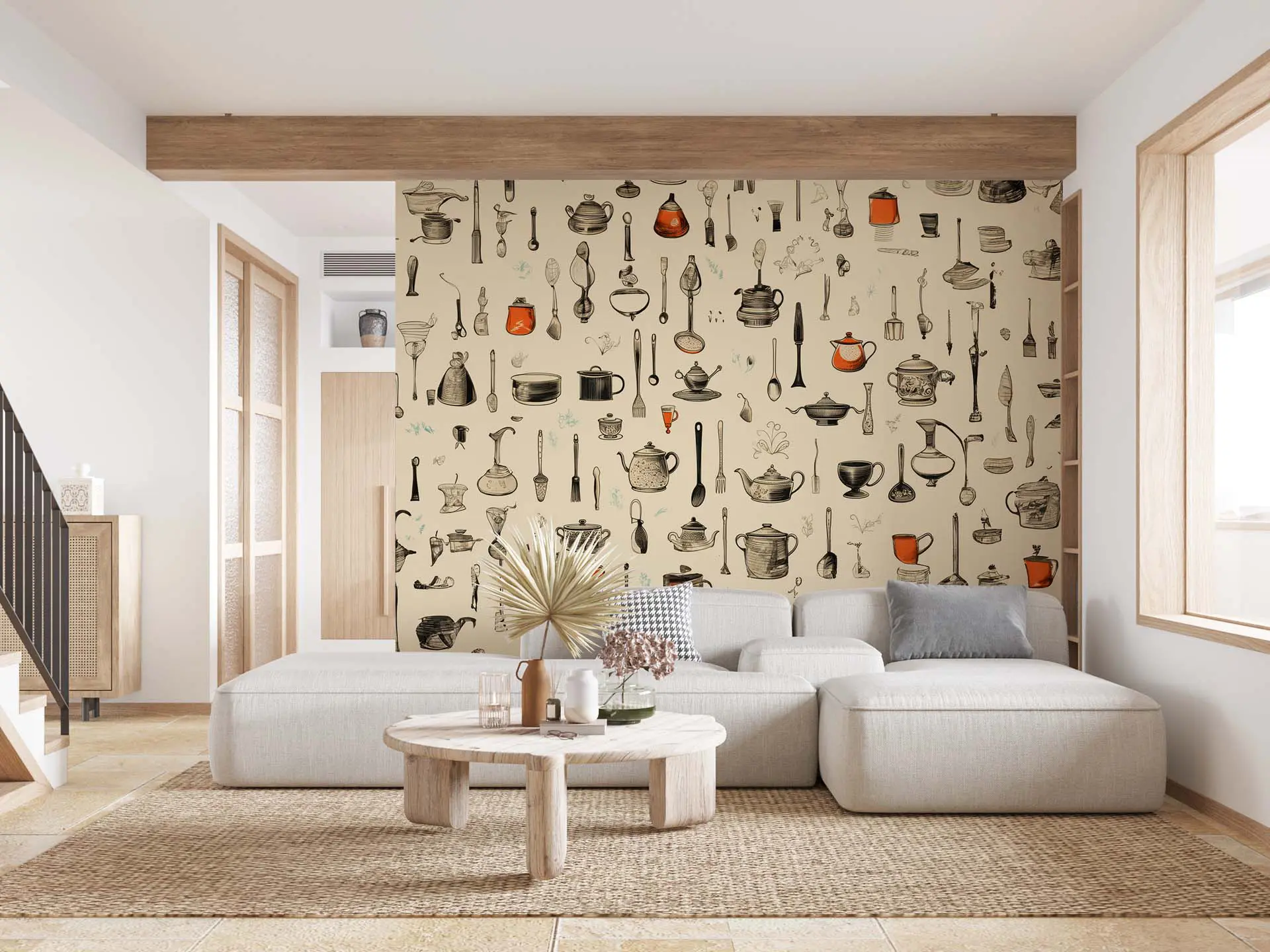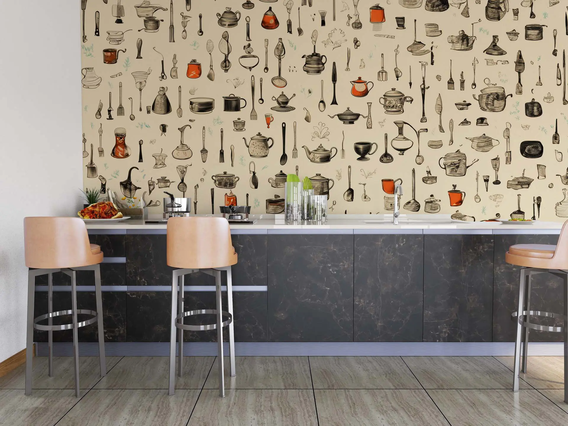Vintage Kitchen Utensils Wallpaper – Retro and Artistic Wall Design Perfect for Kitchens, Cafes, and Dining Areas
