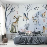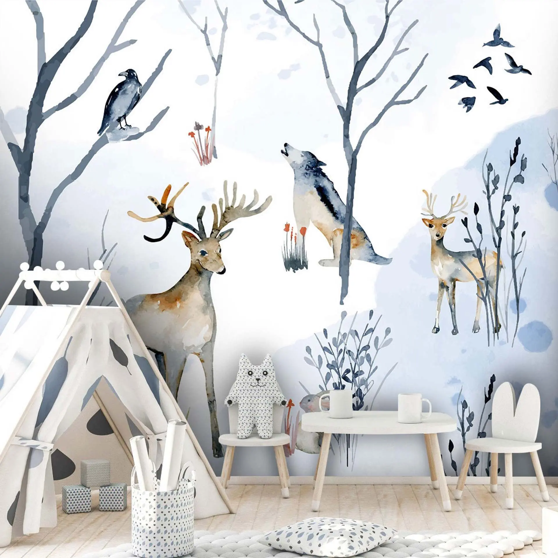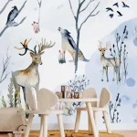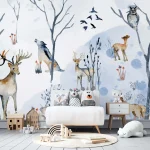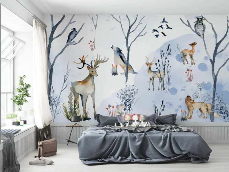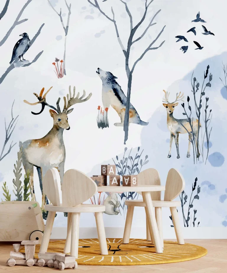 Watercolor Wallpaper with Animals – Deer, Wolf, Owl for Children’s Room & Nursery