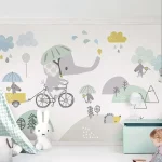 White Background with Colorful Clouds & Raindrops – Cute Animals on Bicycles for Nursery