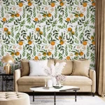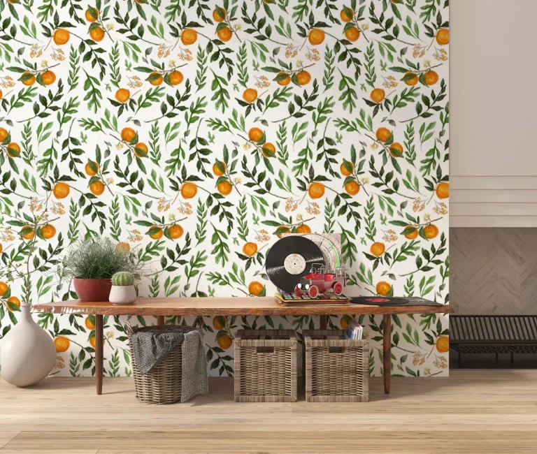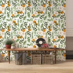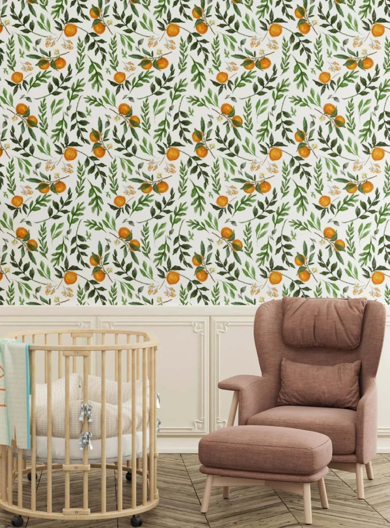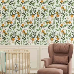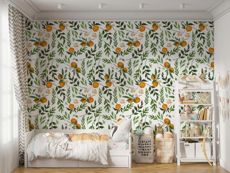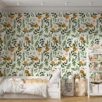 White Background with Orange & Green Leaf Branches Wallpaper – Pastel Color Artistic Decor for Child’s Room