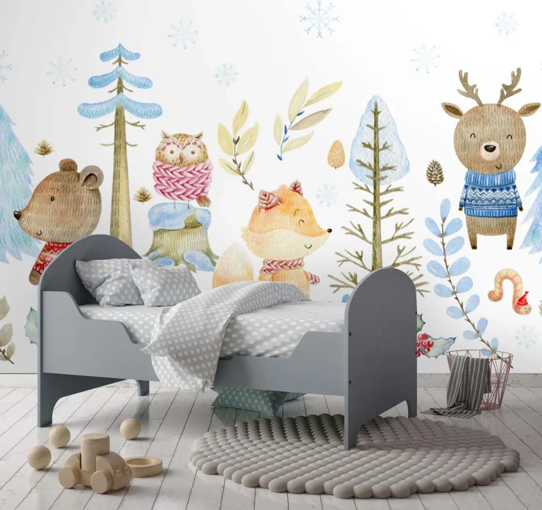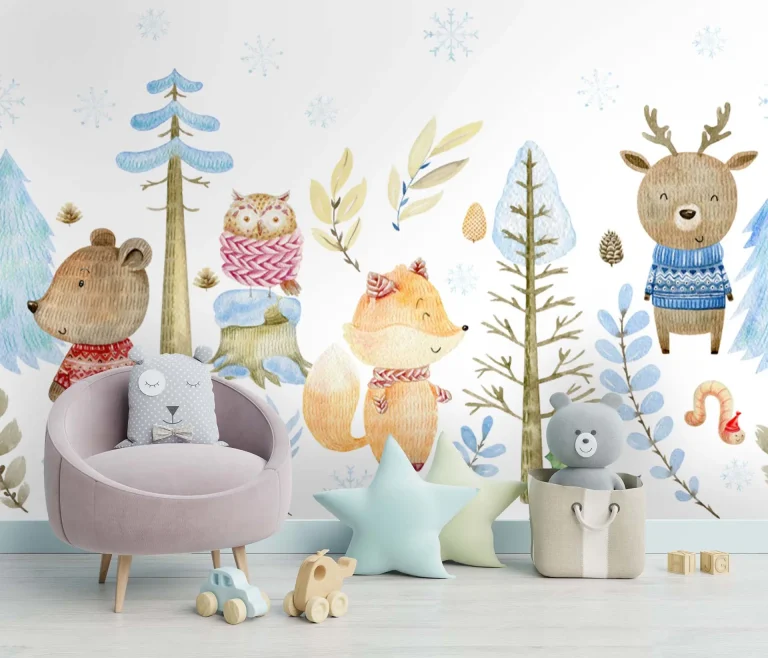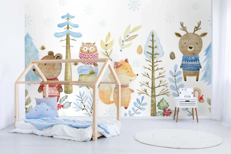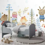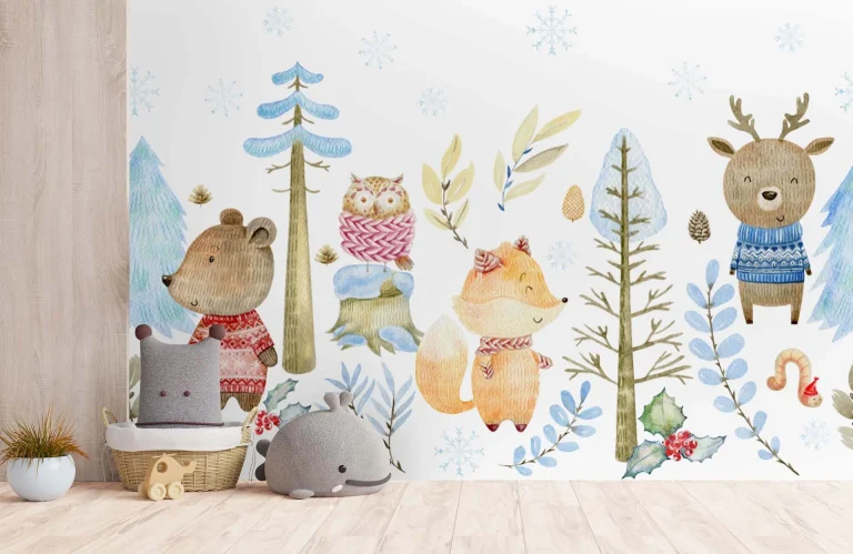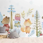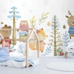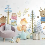 Winter Cartoon Wallpaper with Animals, Snow, Trees for Baby & Child’s Room and Nursery