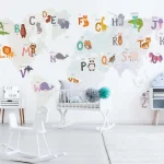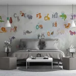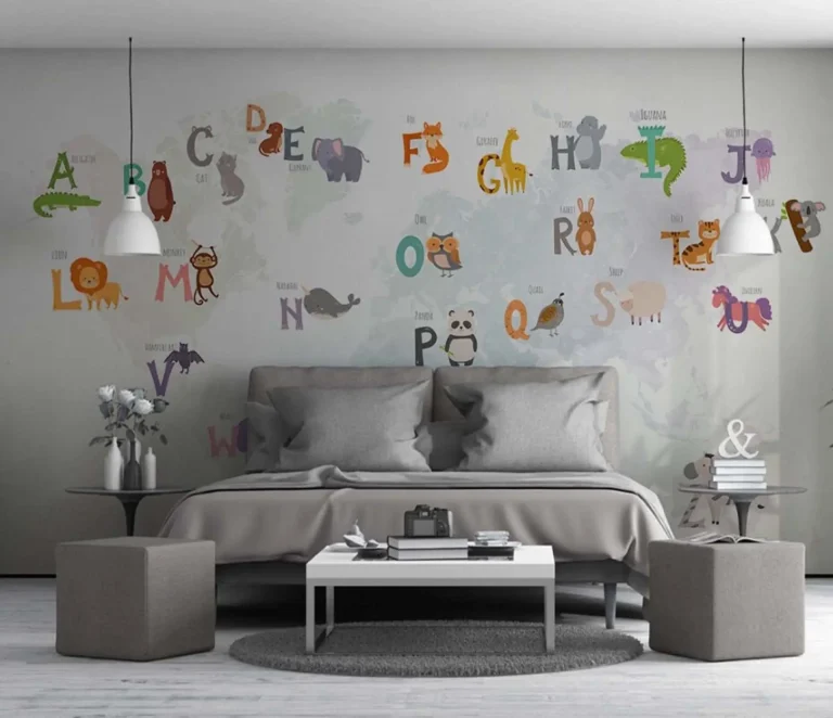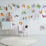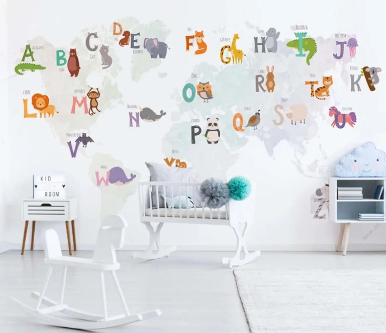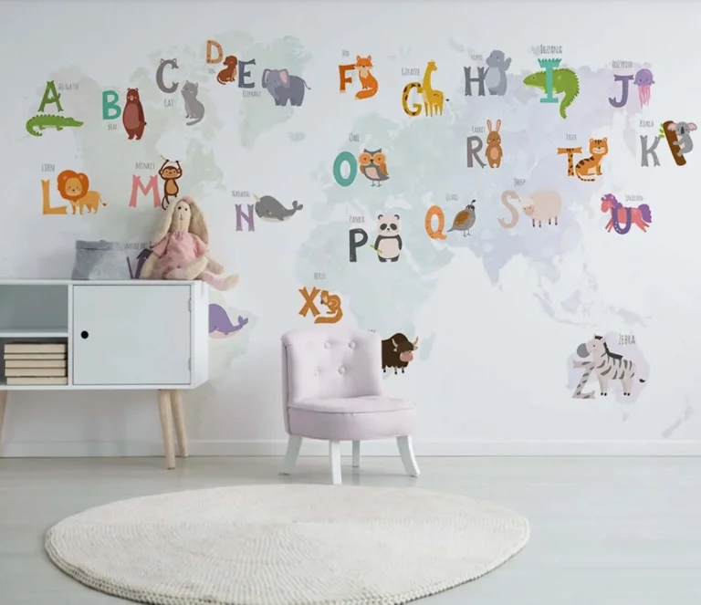 World Map & Alphabet Pastel Nursery Wallpaper – Educational Cartoon Design for Children’s Room