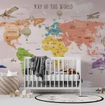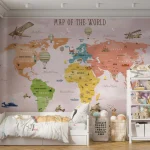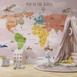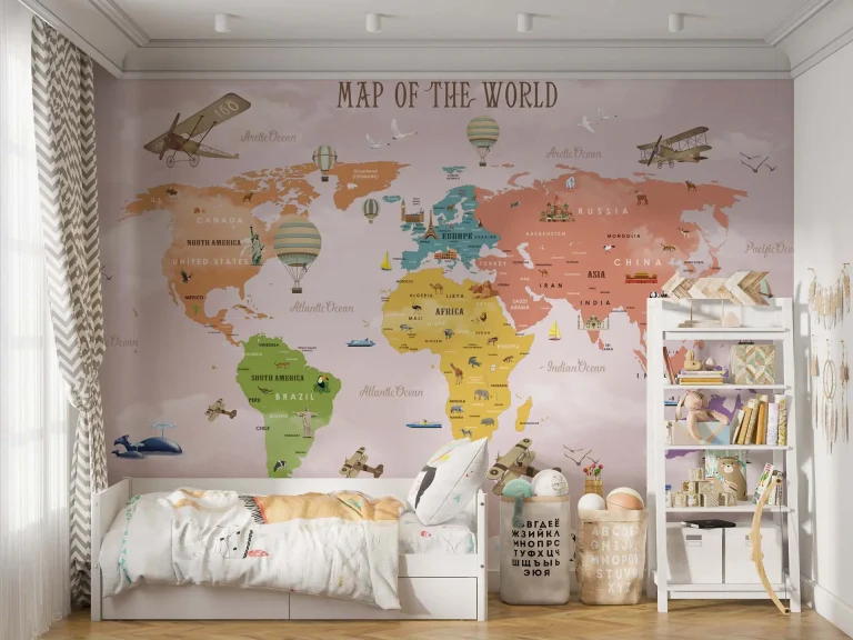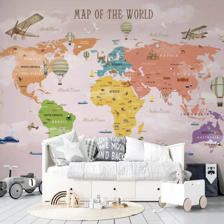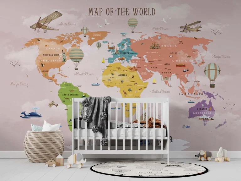 World Map with Retro Transportation, Animals, Pink Oceans & Colorful Continents – Educational and Fun Decor