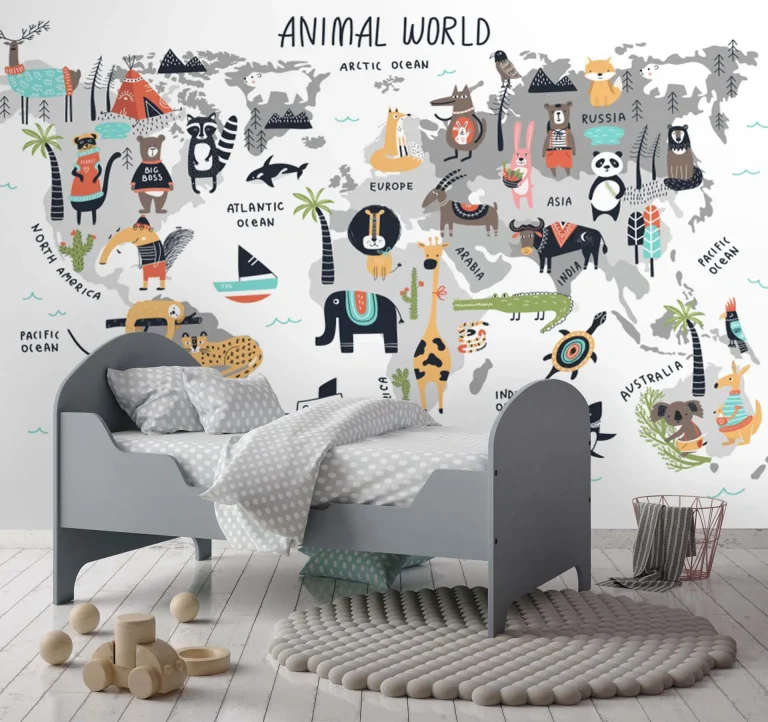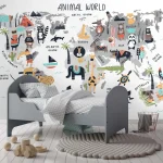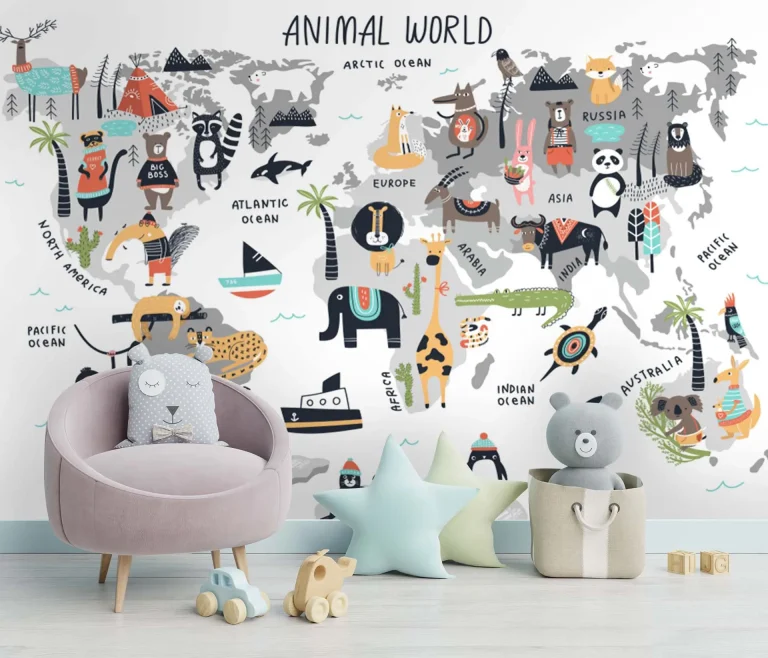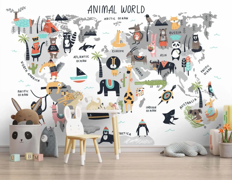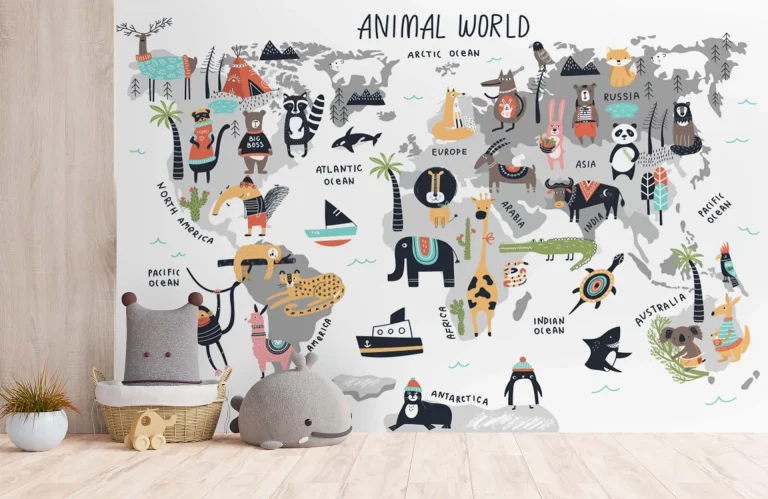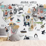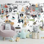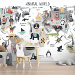 World of Animals Map Cartoon Wallpaper – White Background for Kids Room & Nursery